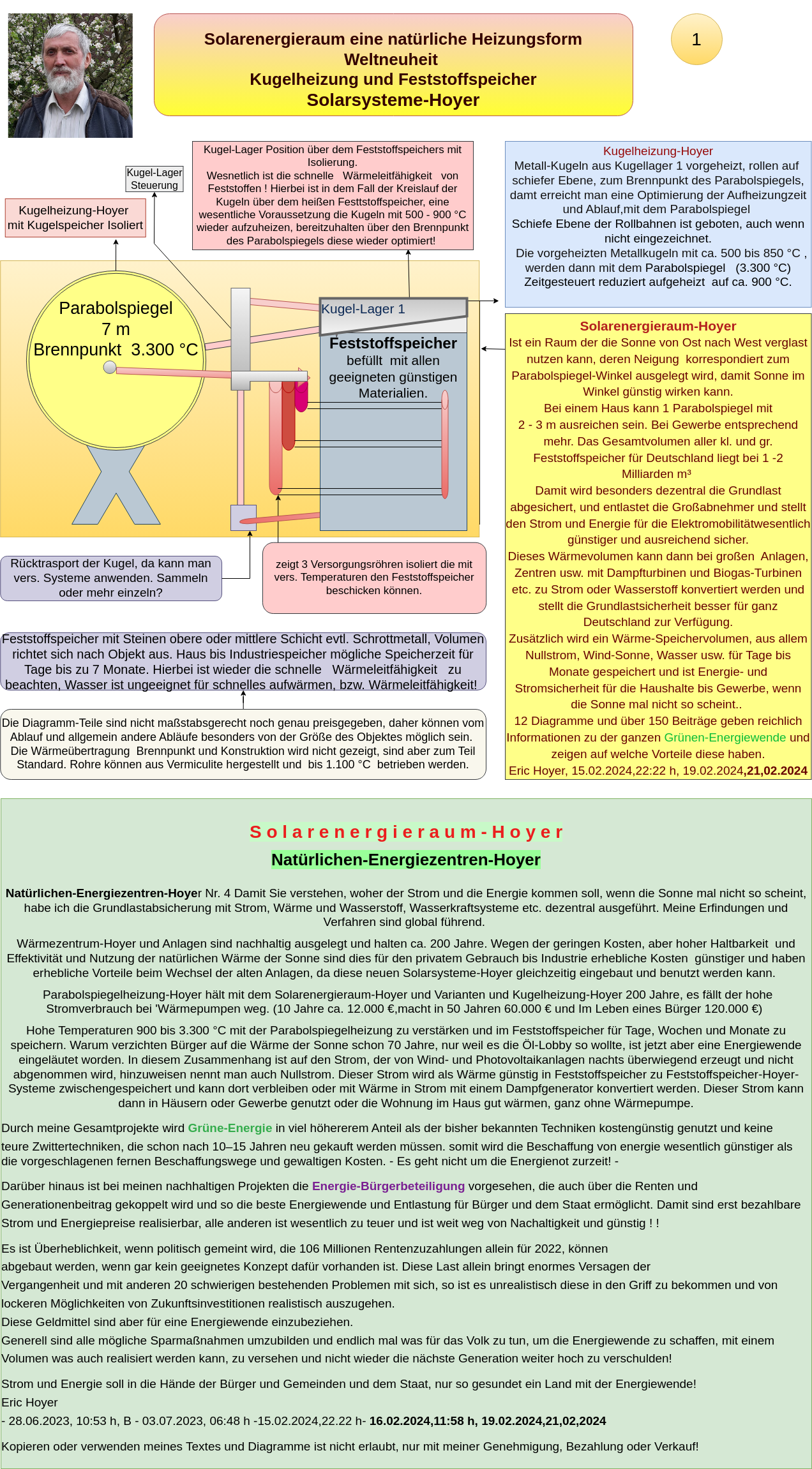 My inventions, processes, and applications – such as the Natural Energy Centers-Hoyer, the Heating-Warming Center-Hoyer, the Sphere Heating-Hoyer, and the Solid Storage-Hoyer – have proven through calculations that electricity, heat, energy, and hydrogen can be generated much more cost-effectively and environmentally friendly using solar heat and the Solar Systems-Hoyer. These systems have the potential to meet the climate goals set for 2045, as they enable a secure base load energy supply through decentralized solutions for communities, cities, businesses, and industries.